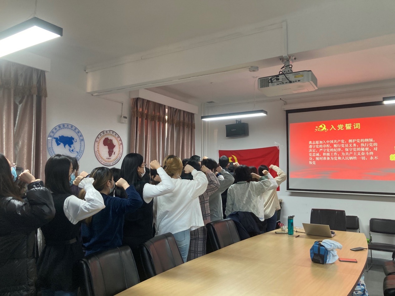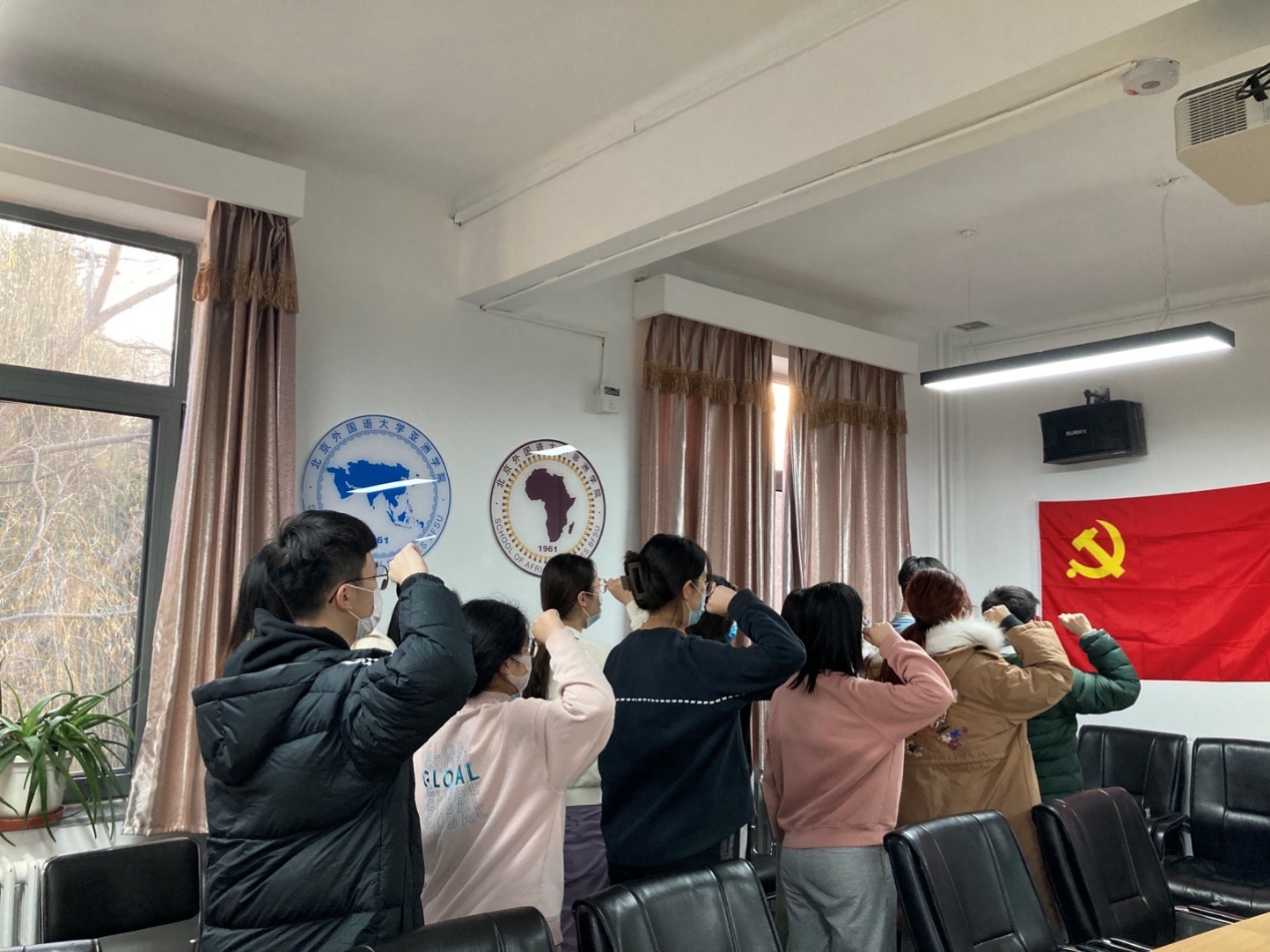 2021年12月3日和12月8日,beat365唯一官方网站、非洲学院本科生党支部在主楼344会议室举行预备党员宣誓仪式,本科生党支部书记郝雪妮出席仪式,2021年度发展的预备党员以及老党员参加会议,仪式由本科生党支部宣传委员李源毓主持。