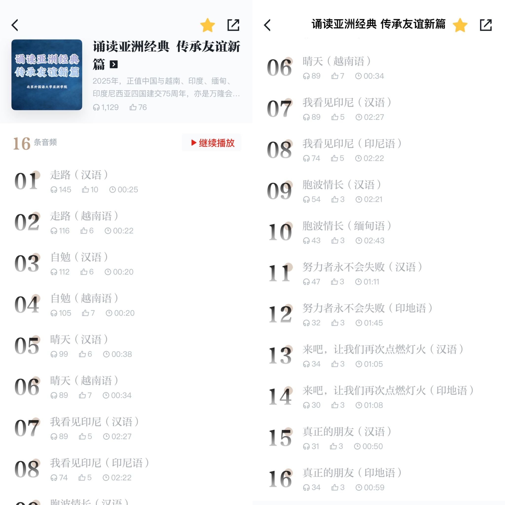 目前,该音频专辑已正式登陆“学习强国”学习平台大学生朗读频道。专辑包含16条作品,涵盖汉语、越南语、印地语、缅甸语、印度尼西亚语五种语言,为广大受众打造了一场沉浸式的亚洲经典听觉盛宴,也成为新时代文明交流互鉴的生动实践。