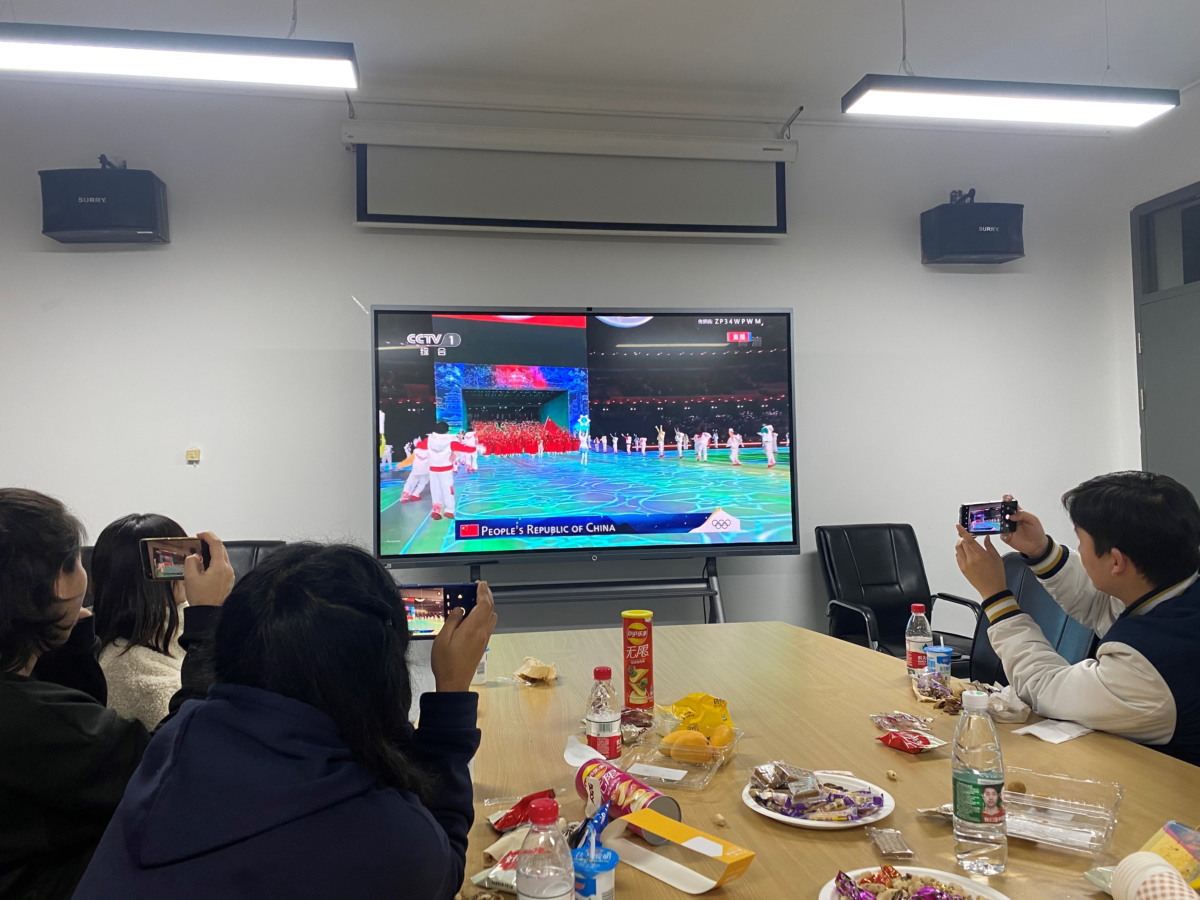 2月4日,留校的同学们在主楼344会议室共同观赏了北京冬奥会的开幕式,在热烈的讨论声中共襄盛会,分享共同的感动。