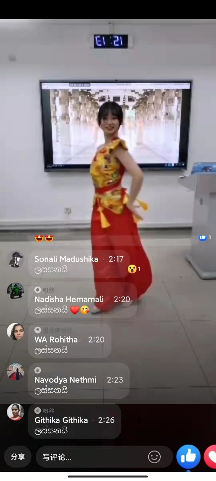 3月18日的直播节目同样是由刘晖校友主持,赵欣同学用僧伽罗语进行了自我介绍,并在随后的直播中展示斯里兰卡传统舞蹈,表演并介绍了中国传统民族舞蹈。其优雅的舞姿和生动的介绍受到了斯里兰卡观众的热烈响应与好评。