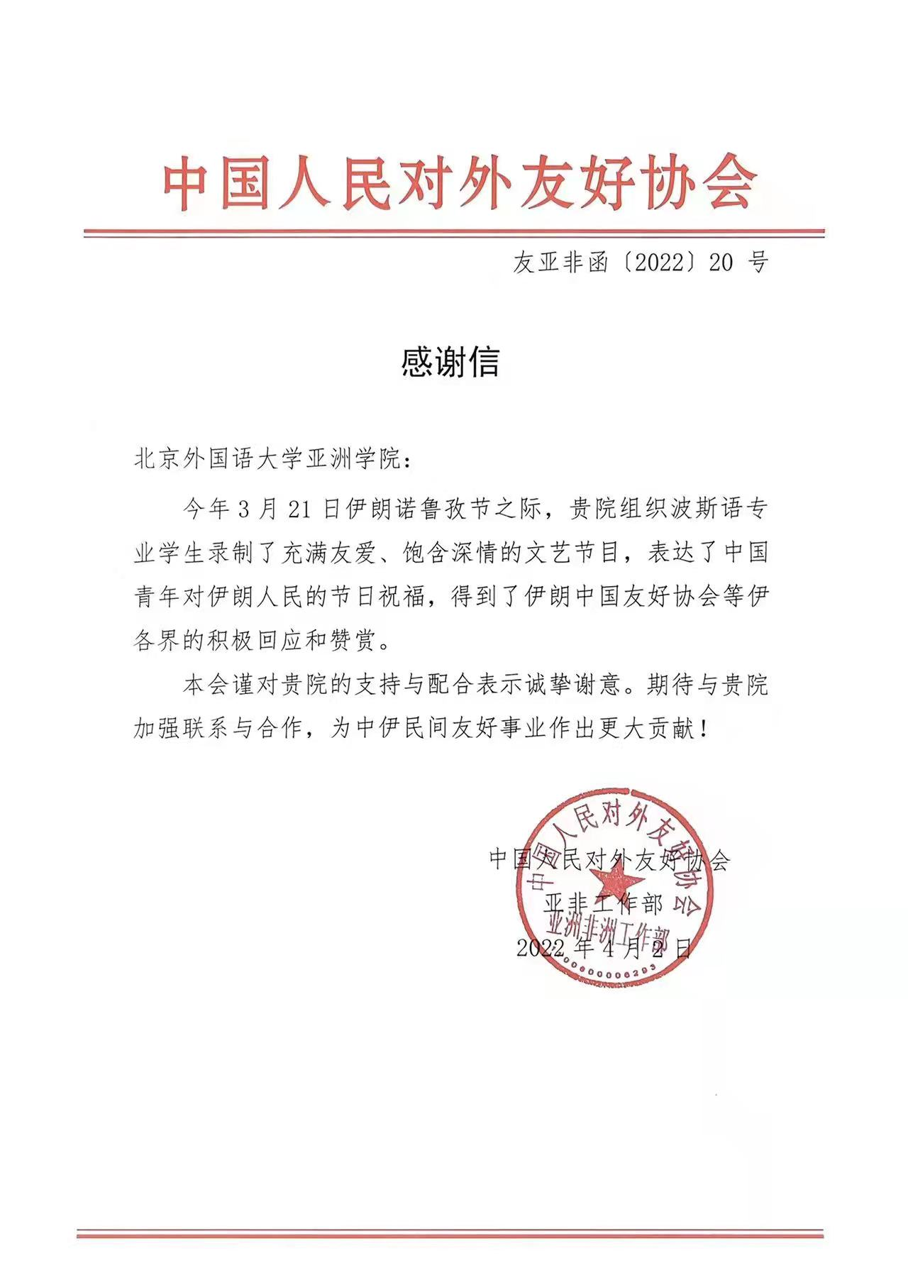 2022年4月2日,中国人民对外友好协会向beat365唯一官方网站发来感谢信,对我院组织波斯语专业学生录制文艺节目一事表示诚挚谢意。