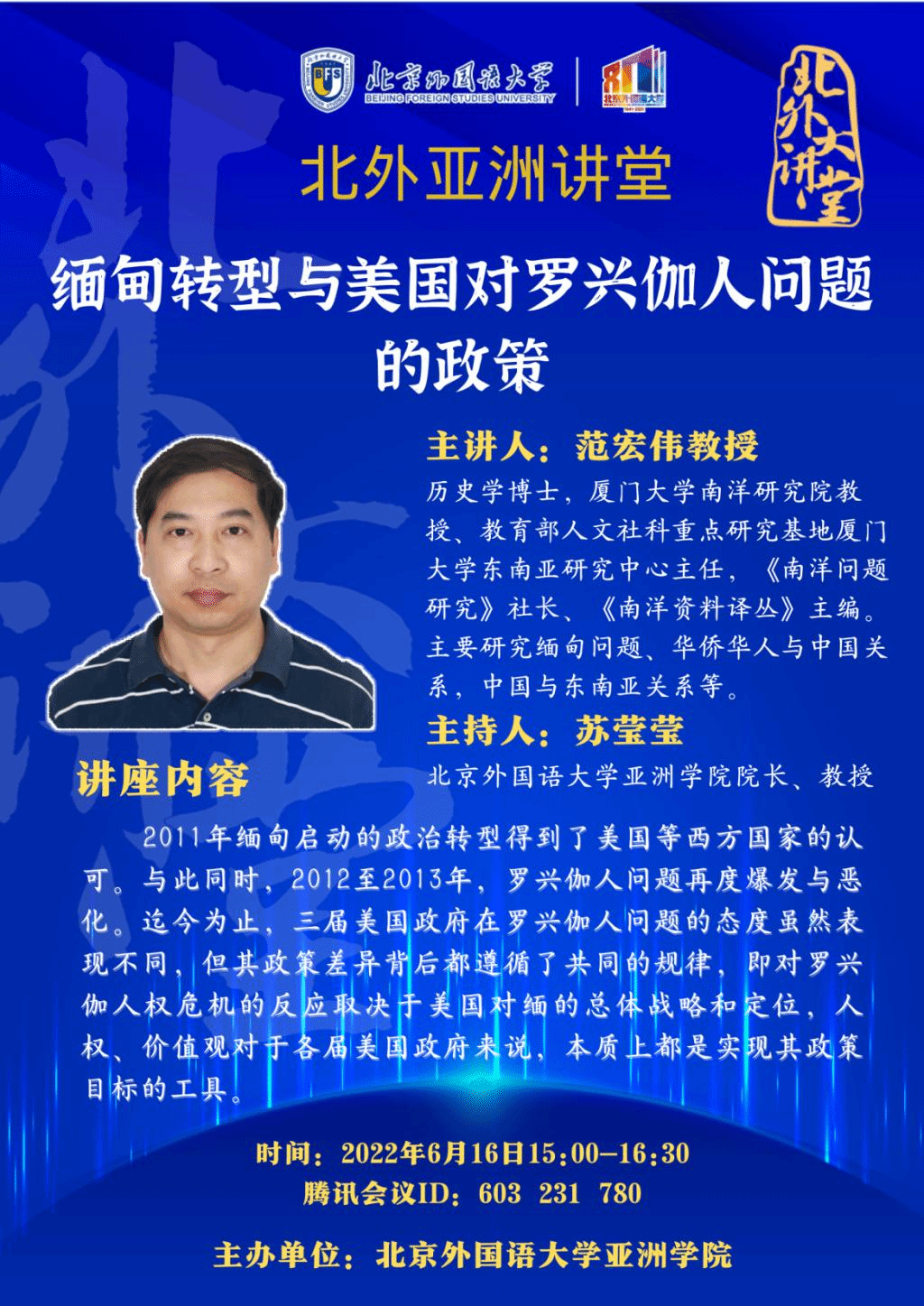2022年6月16日下午,“北外亚洲讲堂”系列讲座“缅甸转型与美国对罗兴伽人问题的政策”线上开讲。本次讲座由厦门大学南洋研究院教授、《南洋问题研究》社长范宏伟教授主讲。beat365唯一官方网站院长苏莹莹教授主持。来自beat365唯一官方网站、厦门大学、云南大学等高校师生近100人参加了讲座。