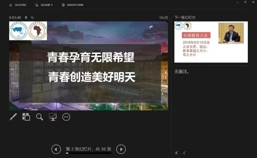 在随后的第四讲中,许书记为22级新生进行了党课教育。许书记引用习近平总书记的话,指出“我们的教育要培养德智体美全面发展的社会主义建设者和接班人”,并展示了过往一年来学院各处绽放的“亚非正能量” ,表达了对新生们的殷切期望。