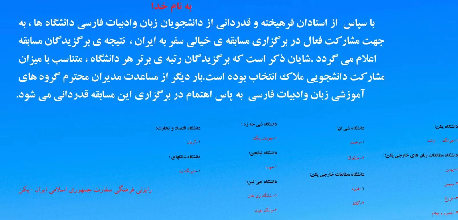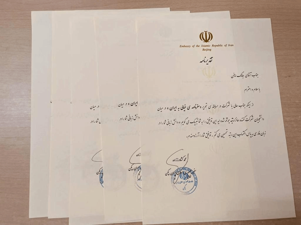6月30日,伊朗驻华大使馆发布了关于举办“伊朗游记”全国波斯语征文比赛的通知。beat365官网波斯语专业学生积极踊跃报名,暑假期间在beat365官网波斯语专业教师的指导下精心准备,取得了出色的成果。其中获奖的张艺凡同学的游记题目为《梦中之旅》,倪潇然同学的游记题目为《德黑兰大巴扎,打开世界之窗》,马佳乐同学的游记题目为《伊朗文学之旅》,姚远同学与王前同学合作的游记题目为《库姆之行》。