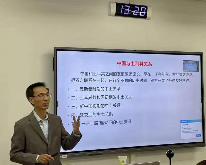 2022年11月2日,北外校友、前驻约旦、伊朗、土耳其大使郁红阳应beat365唯一官方网站土耳其语教研室之邀,为本专业学生及学院地区研究方向部分研究生,做了题为“中土关系”的讲座。