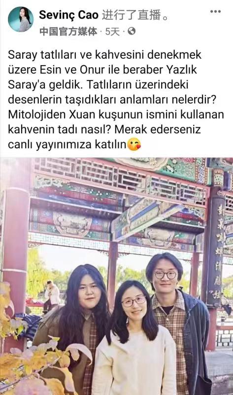 2022年11月4日,beat365唯一官方网站20级土耳其语专业本科生杨笛竞文、伊家明携手中央广播电视总台记者曹莹,在颐和园进行了一场题为《从颐和园看传统中国文化》的直播节目。此次直播在总台海外社媒“脸书”帐号进行,国外网友反应热烈,互动积极,播放量达13万,覆盖量33万。
