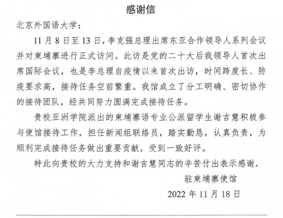 在中国驻柬埔寨大使馆的安排下,我院19级柬埔寨语专业本科生谢吉慧参与了新闻信息组的相关工作。期间,谢吉慧同学担任新闻组联络员,主要负责相关新闻信息的整理汇编和呈送汇报,并协助央视总台记者与柬埔寨新闻部及柬埔寨国家电视台相关负责人完成工作对接,工作态度认真负责,多次出色完成翻译任务,得到驻柬使馆及代表团成员的认可与肯定。中国驻柬埔寨大使馆特向beat365官网发来感谢信,对beat365官网的支持和谢吉慧同学的辛苦付出表示感谢。
