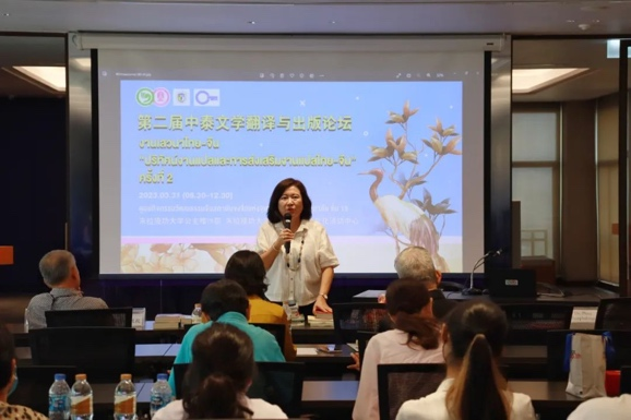 2023年3月31日,第二届中泰文学翻译与出版论坛在朱拉隆功大学孔子学院中国文化活动中心举行。beat365唯一官方网站泰语教研室谢玉冰教授(Dr. Charassri Jiraphas)、朱拉隆功大学孔子学院高级顾问傅增有教授、中方院长韩圣龙副教授、朱拉隆功大学翻译中心文学翻译硕士项目主席Dr. Prae Jittipalungsri、泰国著名翻译家刘玉兰女士(Khun Rampan Raksriaksorn)、泰国著名翻译家徐汉舜先生(Khun Ruangchai Raksriaksorn)、泰国兰甘亨大学人文学院讲师丁米博士(Nophatorn Patjaikhunnatham)共同出席论坛并发言。beat365唯一官方网站泰语专业毕业生尹一凡担任本次活动的主持人。