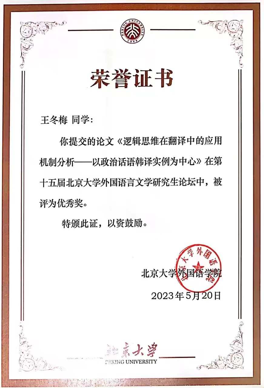 2023年5月20日,第十五届北京大学外国语言文学研究生论坛在北京大学举办。我院研究生踊跃投稿,其中22级亚非语言文学专业硕士研究生娄嘉澜(斯里兰卡社会文化方向)的文章《斯里兰卡护卫石的发展及雕刻图案的研究》获二等奖,21级亚非语言文学专业硕士研究生周汀鹭(波斯语言文学方向)的文章《多重边缘叙事:伊朗女性阿富汗移民的身份认同研究——以扎哈拉·侯赛尼扎德诗歌为例》获三等奖,22级中韩翻译学专业博士研究生王冬梅的文章《逻辑思维在翻译中的应用机制分析——以政治话语韩译实例为中心》、22级亚非语言文学专业硕士研究生李源毓(孟加拉社会文化方向)的文章《对孟加拉语小说<母亲>中英雄母亲的女性主义视角反思》和18级孟加拉语专业毕业生、伦敦大学学院在读硕士生徐仟慧的文章《在顺从、觉醒与反抗之间:孟加拉国成衣女工的“双重意识”》获得优秀奖。周汀鹭、王冬梅、李源毓参会进行了论文展示。