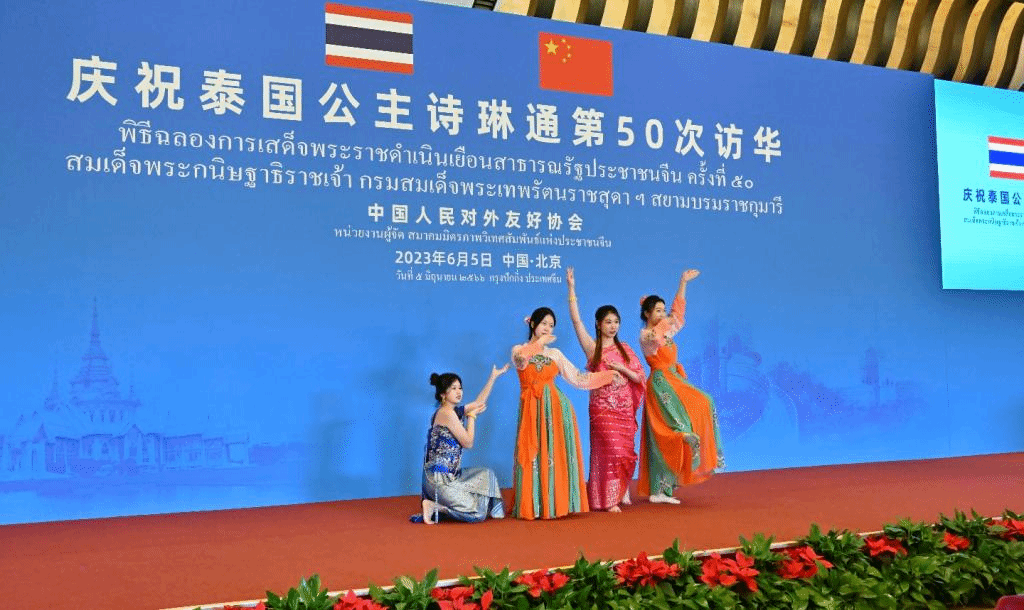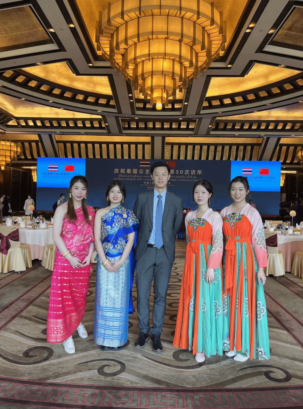 2023年6月5日,庆祝诗琳通公主第50次访华庆祝活动在钓鱼台国宾馆举行,beat365官网beat365唯一官方网站泰语专业2021级本科生受邀表演文艺节目,专业教师田霖为仪式和宴会担任翻译。