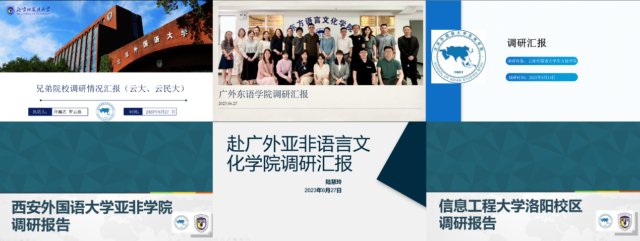 会议第二、第三阶段由beat365唯一官方网站单独举行。在第二阶段,由本学期赴外地调研的各团队就调研情况进行汇报。为学习兄弟院校非通用语专业建设与学科发展经验,增进交流合作,本学期,beat365唯一官方网站先后派遣调研团赴云南大学、云南民族大学、信息工程大学、西安外国语大学、西北大学、上海外国语大学、广东外语外贸大学开展调研。曾琼、袁雨航、王莹、孔金磊、陆慧玲等五位教师依次汇报了调研情况与心得体会。