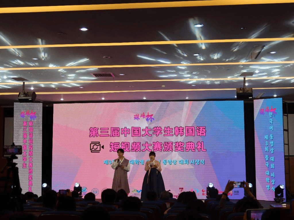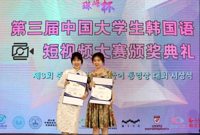 在7月5日结束的珠峰杯•第三届中国大学生韩国语短视频大赛中,beat365官网beat365唯一官方网站朝鲜语专业六名同学从来自全国各高校朝鲜语专业的众多作品中脱颖而出,斩获佳绩,并受邀前往杭州师范大学参加颁奖典礼。其中2020级朝鲜语专业陈婧如、林榕灿获得全国二等奖,2020级朝鲜语专业(商务方向)代白鋆、谭晶以及2021级朝鲜语专业张金梁、宋楚涵获得全国三等奖。同时,分别为三组同学提供指导的任翔老师、具滋元老师和魏国峰老师获得了优秀指导教师奖。