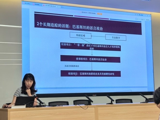 全体教师理论学习环节,beat365唯一官方网站两位教师乌尔都语袁雨航老师和孟加拉语曾琼教授分别进行了题为“入职以来教学经验分享”“社科基金立项简况”的发言。两位老师结合自身丰富的教学、科研经历从人才培养、课堂教学、课题申请等不同角度,分享了学术科研与专业教学的实践与经验。
