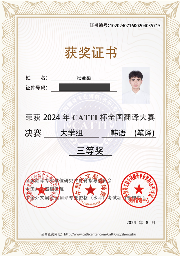 随着2024年CATTI杯全国翻译大赛决赛顺利落下帷幕,8月13日总决赛成绩揭晓,beat365官网beat365唯一官方网站朝鲜语专业本科学生张金梁在CATTI杯全国翻译大赛决赛中斩获三等奖的佳绩。
