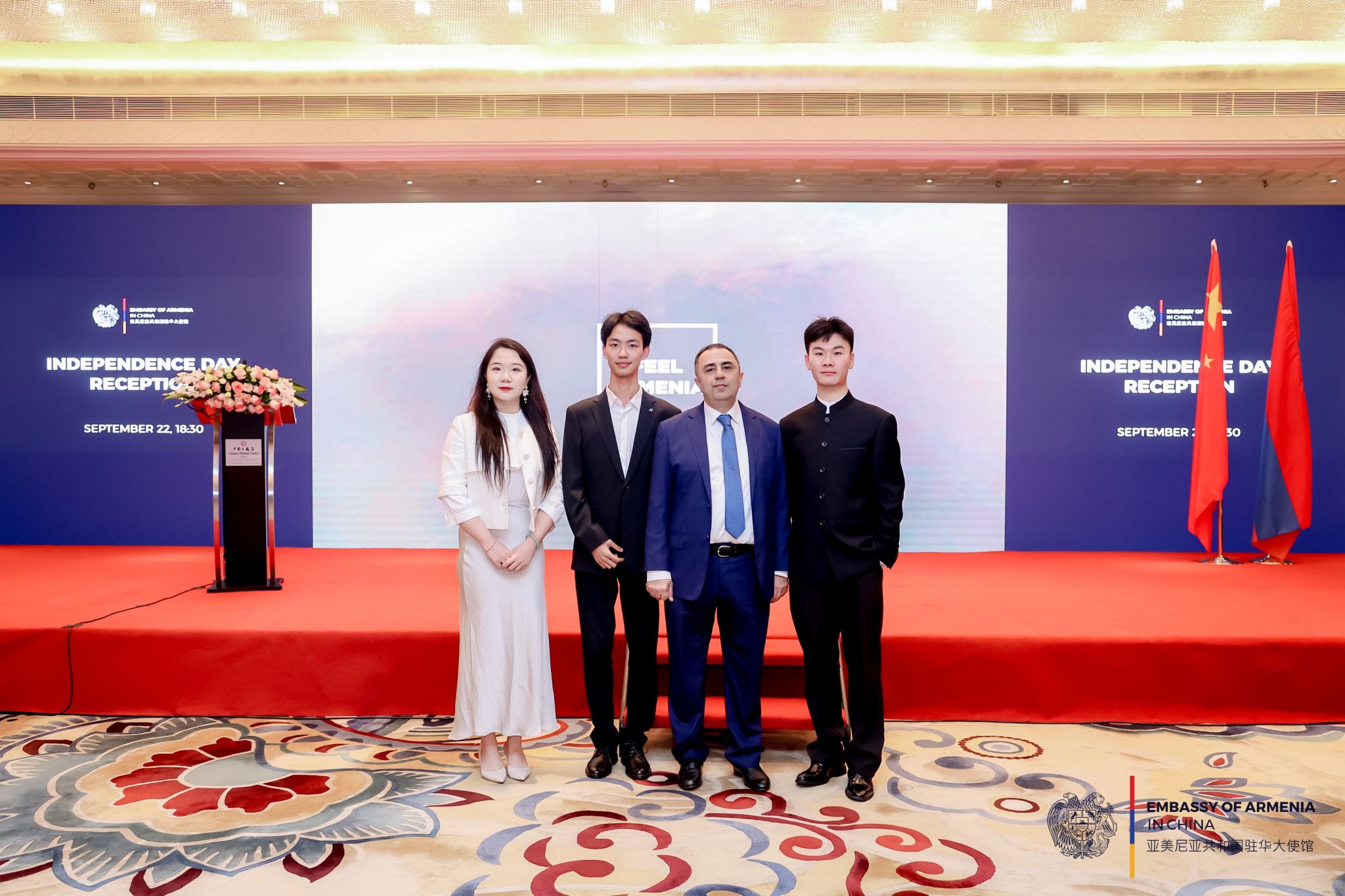 金秋佳节,适逢中华人民共和国欢度国庆之际,亦迎来亚美尼亚共和国独立纪念日。在这双喜交织的美好时节,北外beat365唯一官方网站亚美尼亚语专业师生先后受邀,分别出席了亚美尼亚驻华使馆独立纪念日招待会与中国驻亚美尼亚使馆国庆招待会。