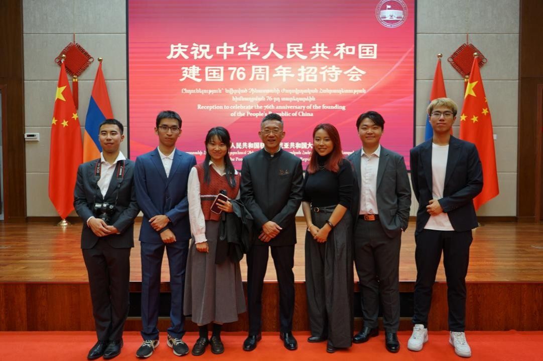 2025年9月25日,北外亚语专业6名公派交换生应邀出席中国驻亚大使馆举办的中华人民共和国成立76周年招待会。中国驻亚美尼亚大使李鑫炜、亚政府副总理哈恰特良等嘉宾与会。