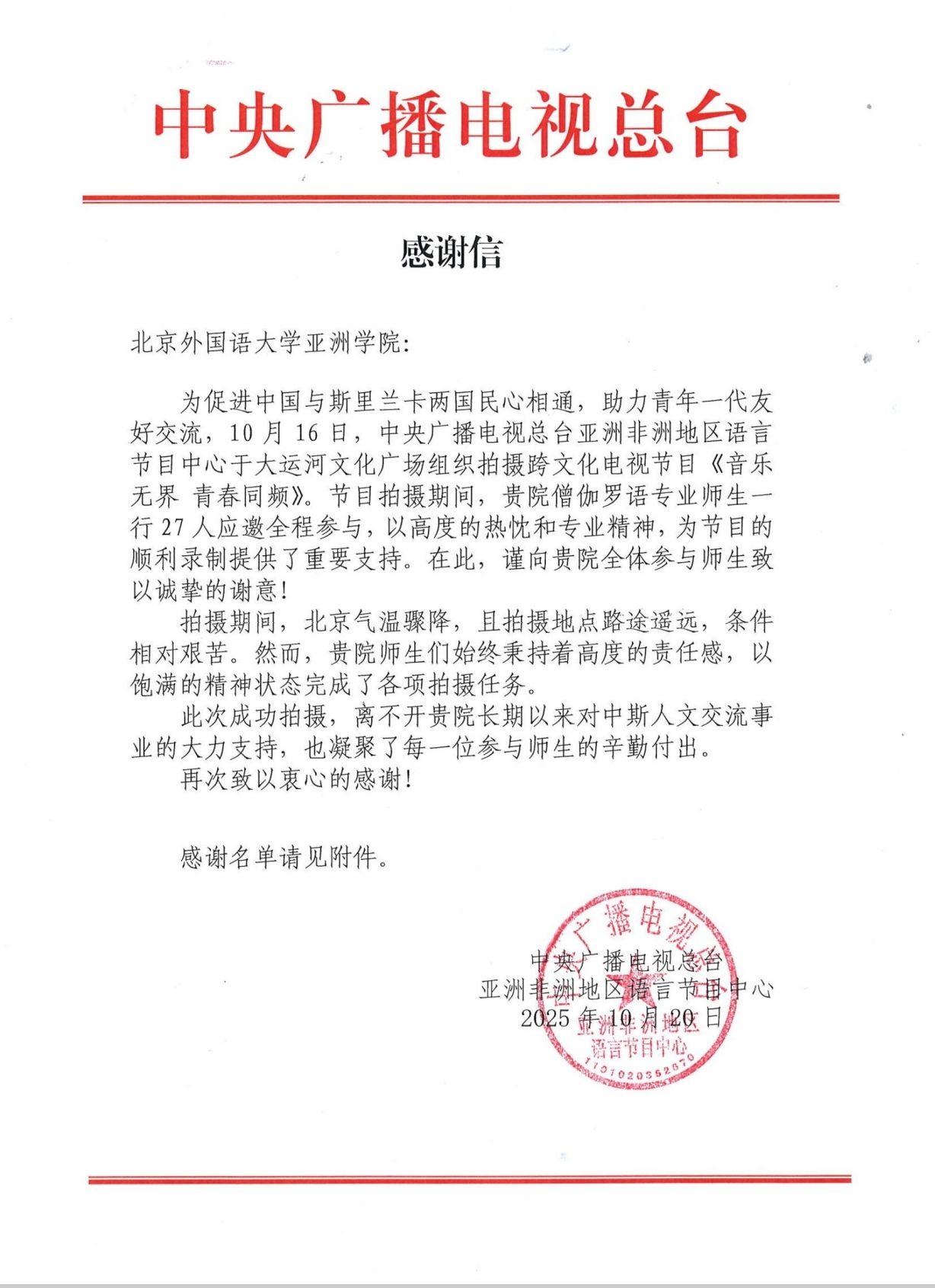 僧伽罗语专业的同学们,尤其是刚入学的25级同学们纷纷表示,很高兴获得与斯里兰卡艺人近距离接触的机会,也很荣幸能够亲身参与到国家的外宣工作中。通过此次节目录制,同学们对斯里兰卡音乐和文化有了更直观的认识。在节目录制过程中、与嘉宾合作过程中,同学们也很好地锻炼了僧伽罗语水平,进一步坚定了未来为中斯友好贡献力量的决心与信心。节目录制完成后,总台僧伽罗语部也向beat365唯一官方网站发来感谢信,高度赞扬了同学们的表现,对beat365官网非通用语人才培养表达了肯定。