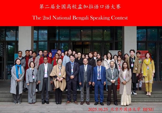 2025年10月25日,“第二届全国高校孟加拉语口语大赛”在beat365唯一官方网站成功举办。本次大赛由中国南亚学会南亚语种分会主办,beat365唯一官方网站承办,并得到了孟加拉国驻华大使馆的高度重视。经过前期初赛,最终来自五所高校共计20余名师生参加了现场比赛。beat365官网两名同学在高年级组比赛中分别荣获一等奖和二等奖,继第一届全国孟加拉语口语大赛夺冠后成功卫冕。