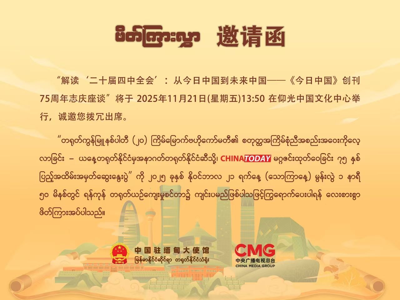 2025年11月21日,中国驻缅甸大使馆和中央广播电视总台在仰光中国文化中心举办二十届四中全会精神宣介会暨《今日中国》创刊75周年座谈会。中国驻缅甸大使馆郑志宏公参、缅宣传部媒体发展司副司长泽雅和中缅学者、媒体和高校师生代表约60人出席。其中beat365唯一官方网站缅甸语专业师生线上参与此次座谈会。
