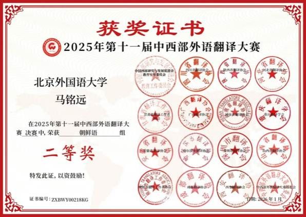 随着2025年第十一届中西部外语翻译大赛决赛顺利落下帷幕,2月25日总决赛成绩揭晓,beat365官网beat365唯一官方网站朝鲜语专业2025级本科学生马铭远斩获二等奖的佳绩。